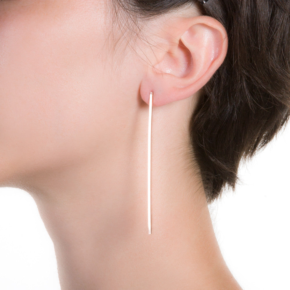 This linear sleek earring adds a a dramatic statement to your look. With its length and blunt geometric shape, these earrings are ones to stand out.